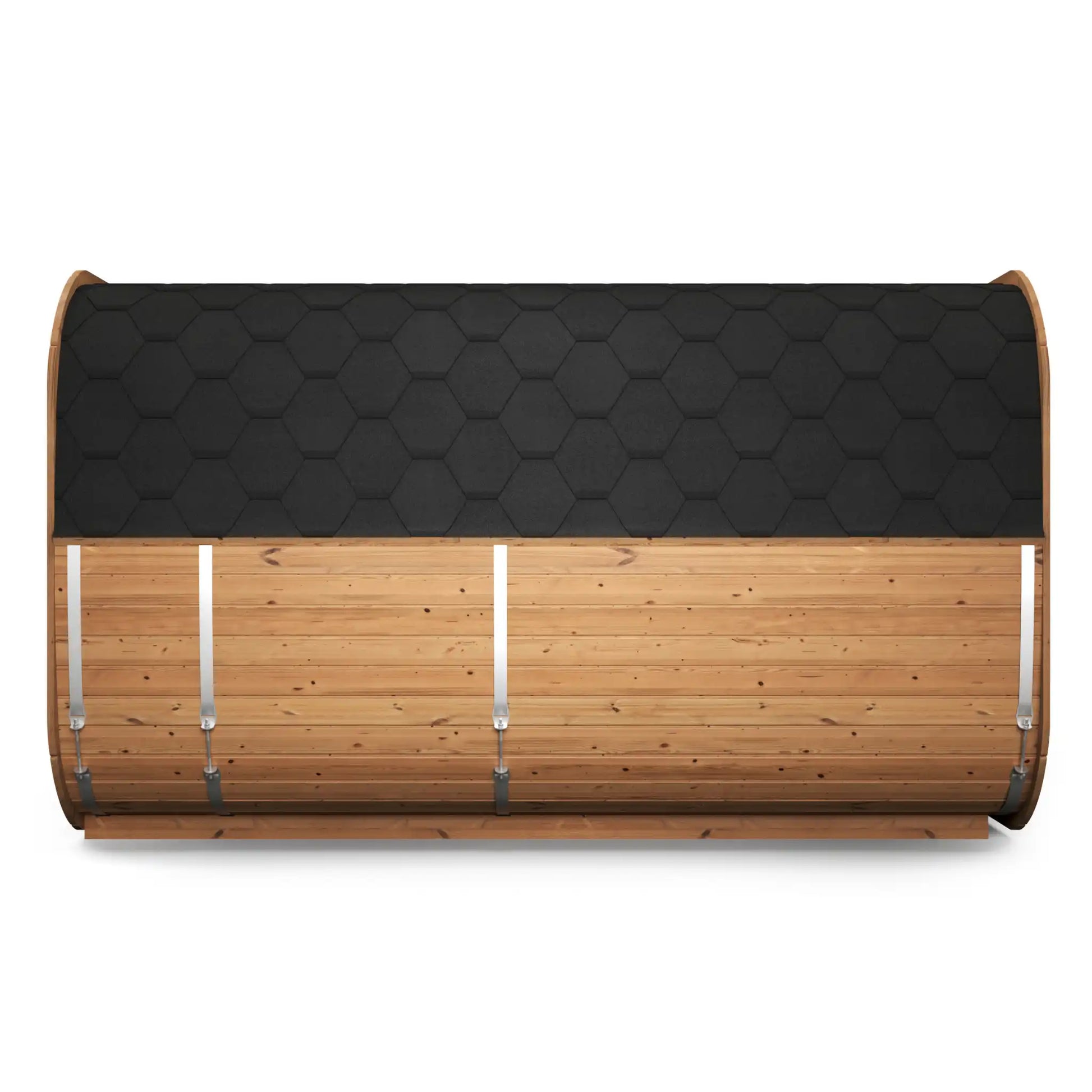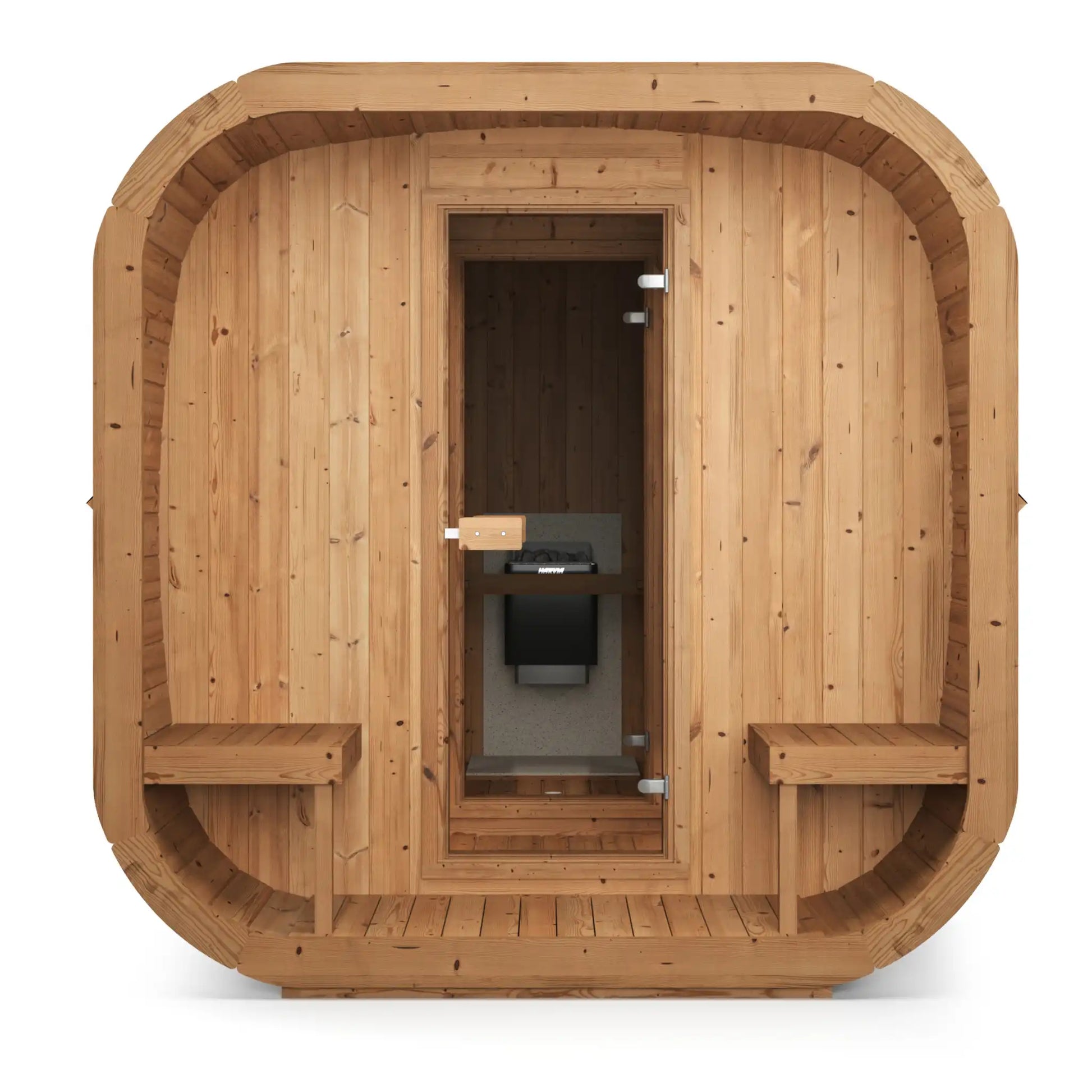 Kassalaga (cube-like) hönnun fellur vel að nútímagörðum. Hún býður upp á meira bakrými en hefðbundin tunnusauna og er samt auðveld í samsetningu og flutningi.