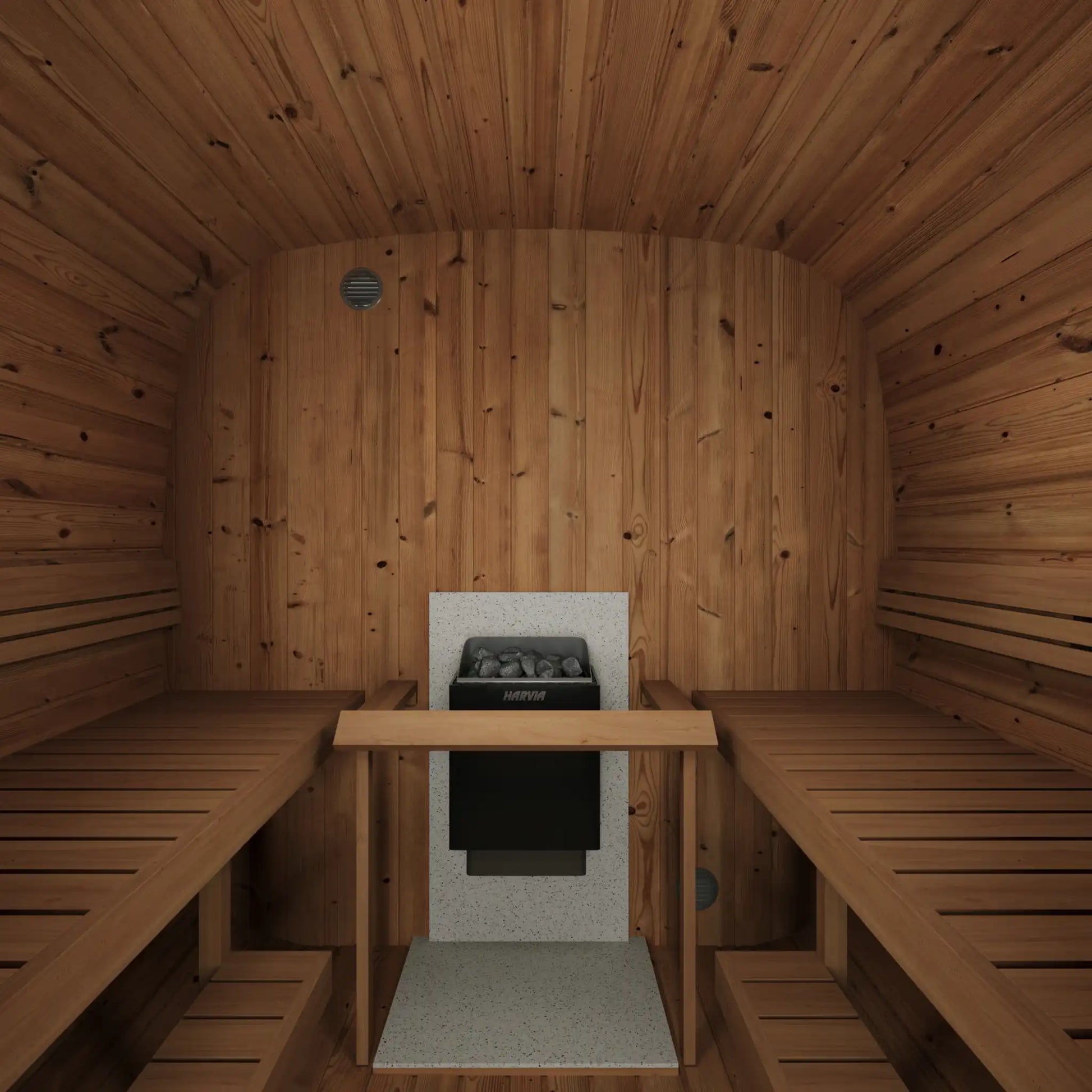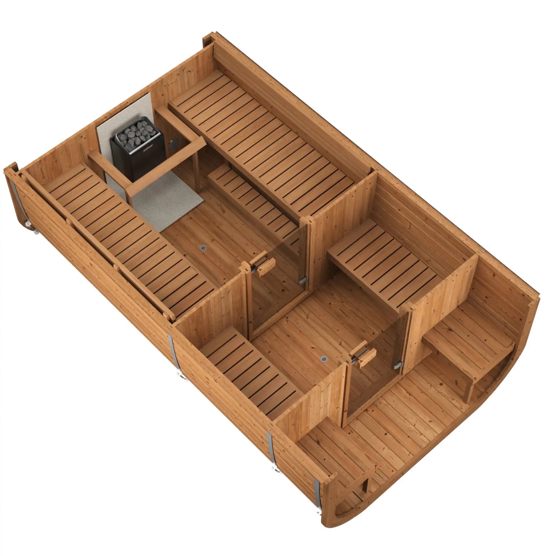 Tveggja rýma hönnun með sér búnings-/slökunarrými gerir þér kleift að taka hlé frá hitanum og njóta samveru. Aukaherbergið hjálpar einnig til við að draga úr hitatapi í saunarýminu. Hentar bæði fyrir rafmagns- og viðarkynta hitara að vali kaupanda.
