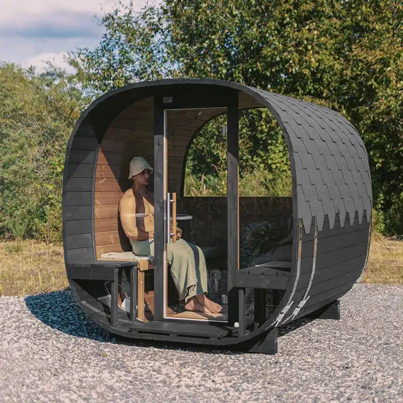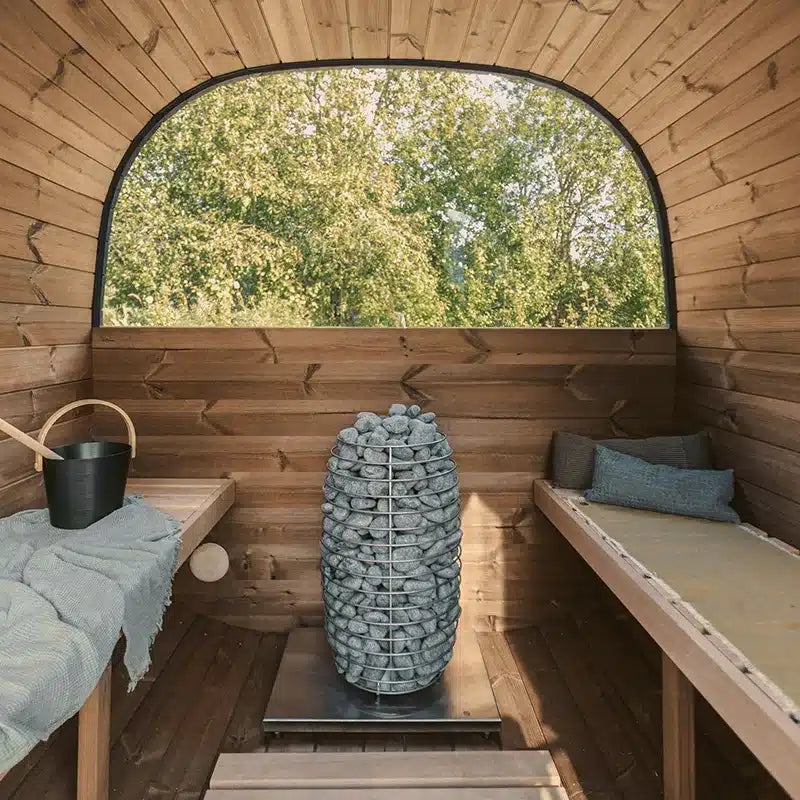 Pano er falleg svokölluð Panorama kubba sauna með gleri bæði að framan og aftan