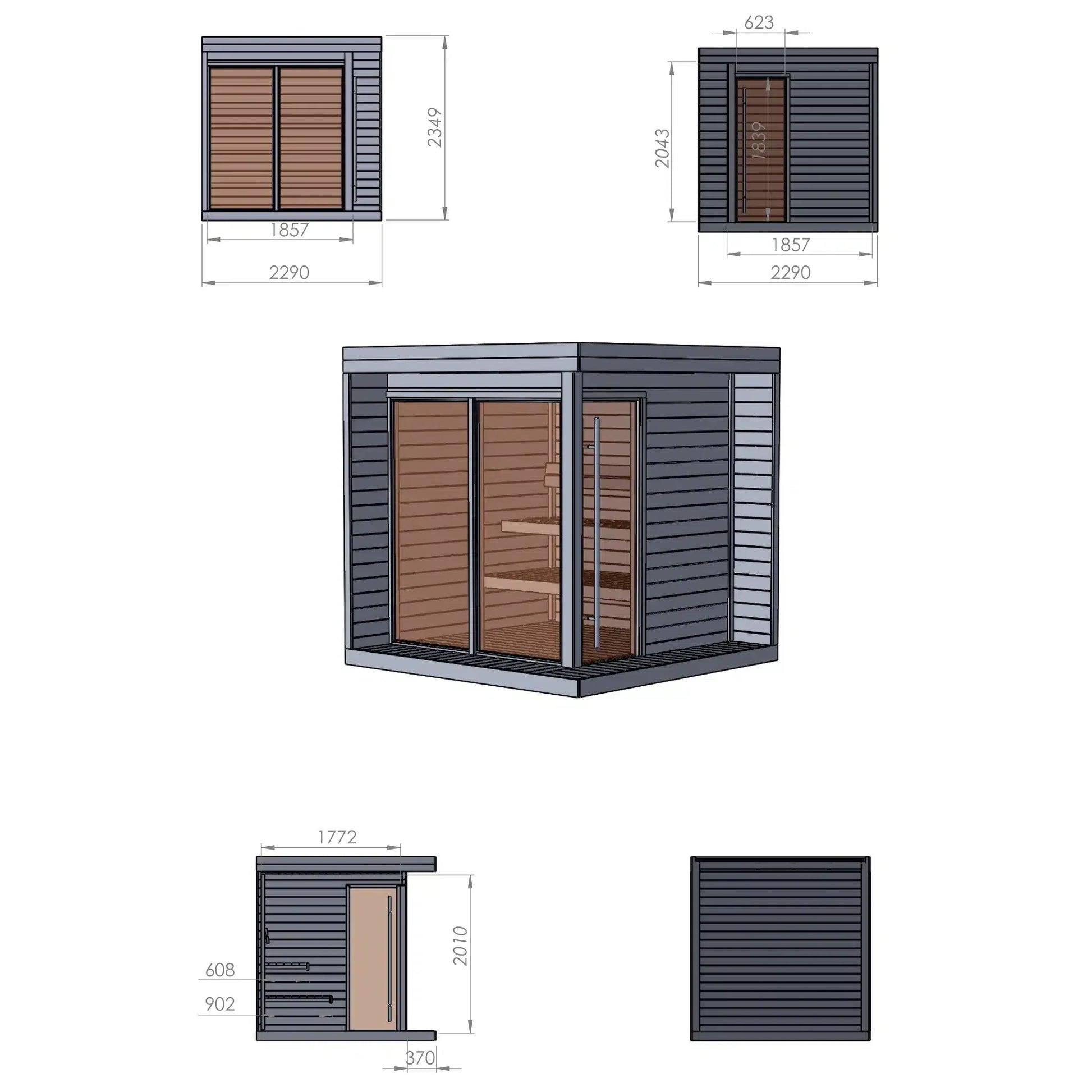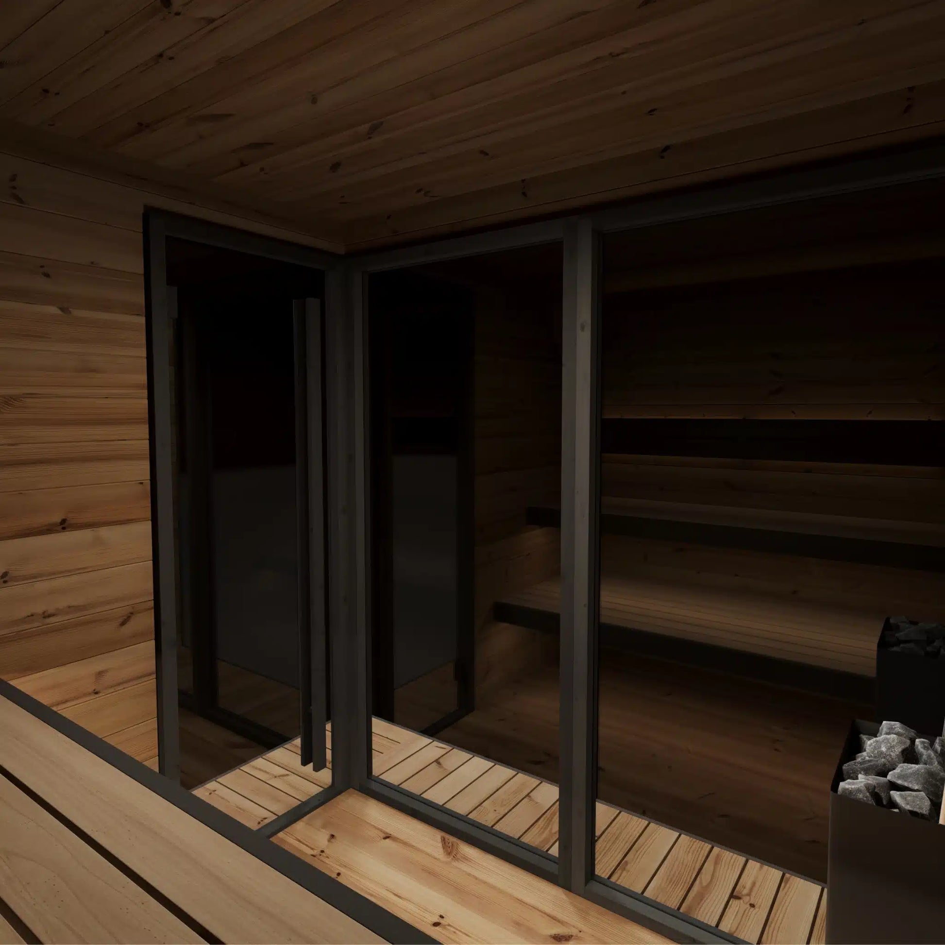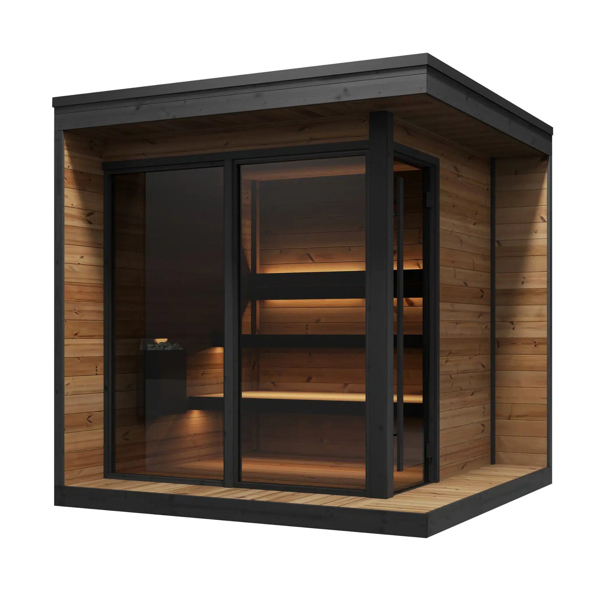 Innra rýmið, 6,3 m³, er fullkomið fyrir persónulegar saunustundir eða samveru. Tveggja hæða bekkir úr mjúkri hitameðhöndlaðri ösp veita náttúruleg þægindi, á meðan stór bronslituð glerflötur hleypa dagsljósi inn en viðhalda næði og ró. Öll efni, innan sem utan, eru valin fyrir fegurð og endingu svo Stormur eldist jafn fallega og hún tekur á móti þér.